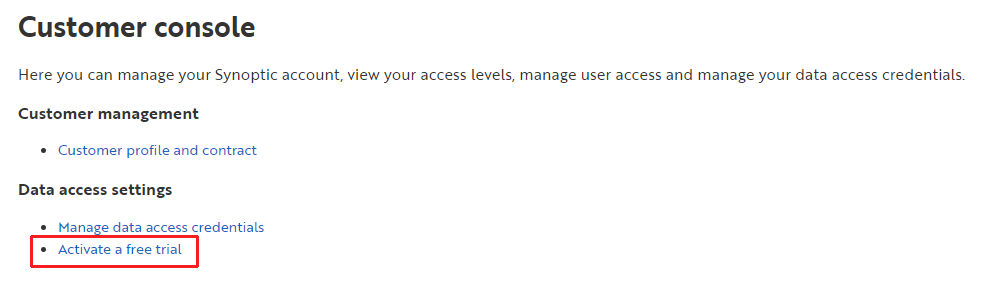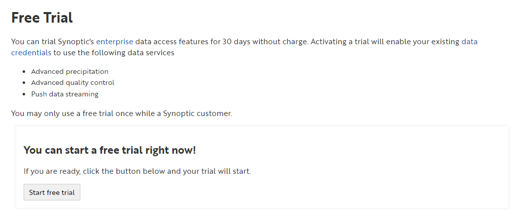 Visit the customer console at http://customer.synopticdata.com , there on the Home under Data access settings click “Activate a free trial”.