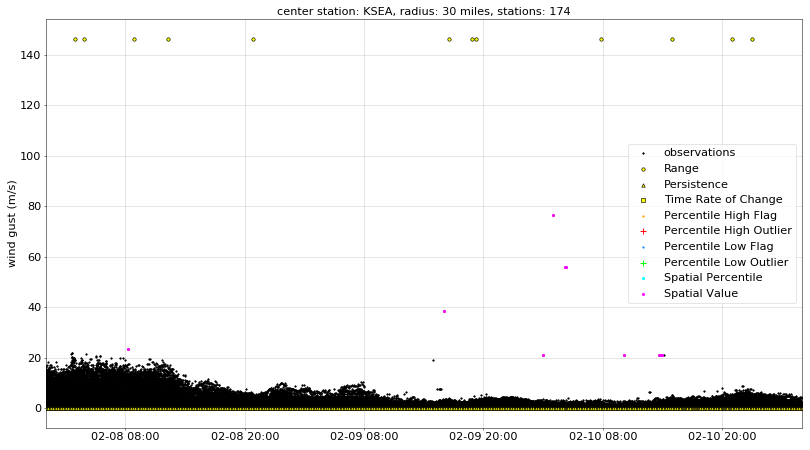 | Compares the current observation value to nearest-in-time values from neighboring stations within distance and elevation thresholds (air temperature, relative humidity, dew point temperature, wind speed, wind gust, pressure and altimeter). | |